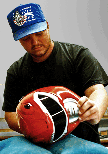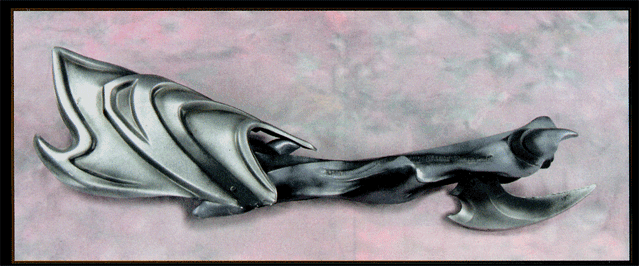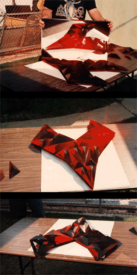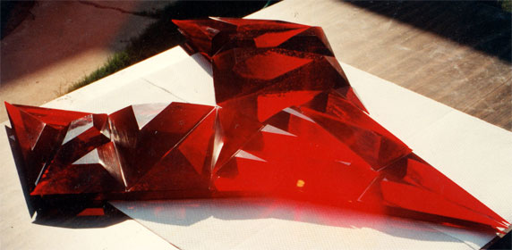 Deep Red The Sci-Fi Channel Main "title" spacecraft (Shown work in progress) Laminated red acrylic cut, and polished All facets created by laminating .25" acrylic sheet Some facets consisted of as many as 10 painstakingly bubble free laminations. Facets were cut out, poished, and assembled into spacecraft's final shape |